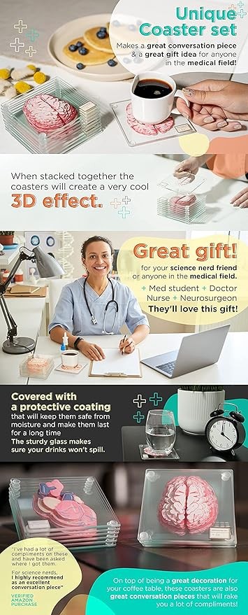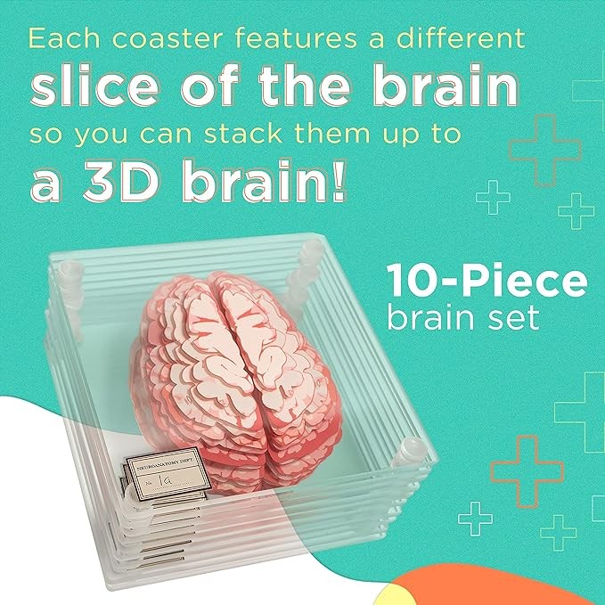 Celebrate your brain problems with these brain specimen coasters! This 10-piece coaster features a brain. When stacked together, it completes a complete brain! Think about it!