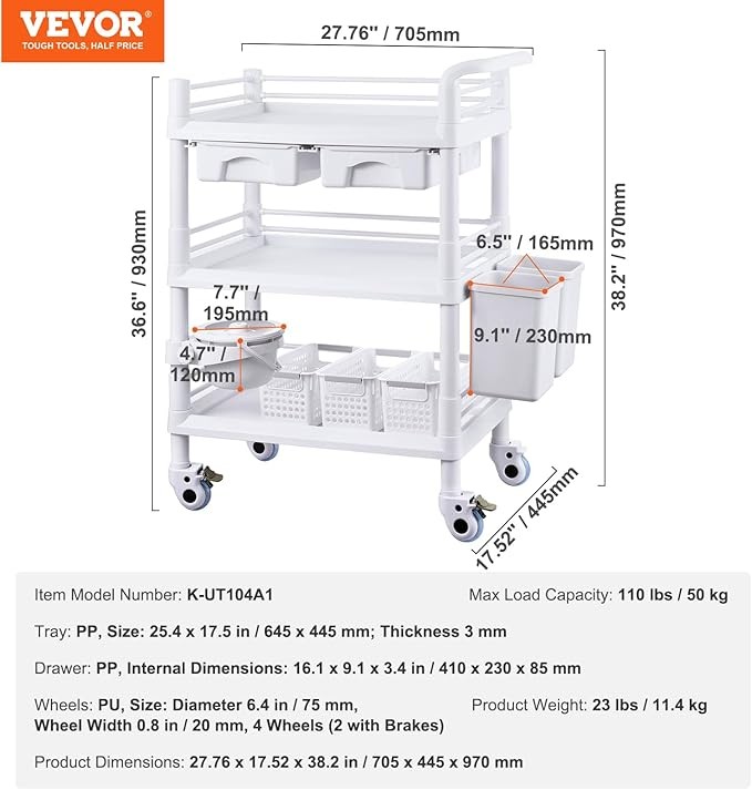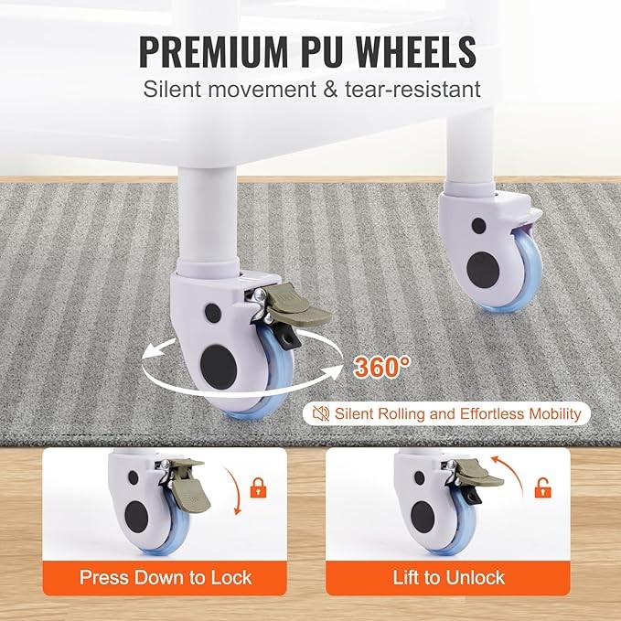 Stable load-bearing: This laboratory cart is designed to safely fix medical equipment. It not only has a solid load-bearing capacity of 110 pounds, but also has a widened top tray to ensure the safe and stable placement of your medical equipment. The non-slip edge further enhances the stability and safety of the article. Efficient storage: With multiple layers and sufficient capacity, the laboratory utility vehicle can efficiently sort out various supplies. The upper tray and the lower drawer provide rich storage space, which is convenient for sorting and storing various medical and laboratory supplies. Unique drawer design, equipped with hidden silent guide rail, to ensure privacy and easy access. Durable materials: excellent impact resistance and chemical corrosion resistance ensure that medical vehicles remain as good as new for a long time and reduce maintenance costs. Made of high-density ABS material, reinforced by internal steel plate, VEVOR's cart is wear-resistant and impact-resistant in daily use, ensuring long-term reliability. "Comfortable operation" ergonomic handle, comfortable grip and easy push. Equipped with four silent wear-resistant wheels, including locking rubber wheels, it can provide stable and quiet thrust regardless of linear movement or flexible operation. Flexible adaptation: Whether in busy hospitals, professional laboratories or home care places, this rolling laboratory cart can easily adapt to provide convenient storage and transportation solutions. Its wide application range makes it the first choice for health care professionals, nurses, beauticians and others.