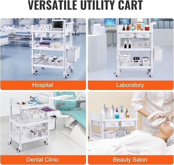 Stable load-bearing: This laboratory cart is designed to safely fix medical equipment. It not only has a solid load-bearing capacity of 110 pounds, but also has a widened top tray to ensure the safe and stable placement of your medical equipment. The non-slip edge further enhances the stability and safety of the article. Efficient storage: With multiple layers and sufficient capacity, the laboratory utility vehicle can efficiently sort out various supplies. The upper tray and the lower drawer provide rich storage space, which is convenient for sorting and storing various medical and laboratory supplies. Unique drawer design, equipped with hidden silent guide rail, to ensure privacy and easy access. Durable materials: excellent impact resistance and chemical corrosion resistance ensure that medical vehicles remain as good as new for a long time and reduce maintenance costs. Made of high-density ABS material, reinforced by internal steel plate, VEVOR's cart is wear-resistant and impact-resistant in daily use, ensuring long-term reliability. "Comfortable operation" ergonomic handle, comfortable grip and easy push. Equipped with four silent wear-resistant wheels, including locking rubber wheels, it can provide stable and quiet thrust regardless of linear movement or flexible operation. Flexible adaptation: Whether in busy hospitals, professional laboratories or home care places, this rolling laboratory cart can easily adapt to provide convenient storage and transportation solutions. Its wide application range makes it the first choice for health care professionals, nurses, beauticians and others.